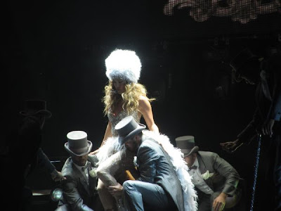 For someone of Jennifer's stature, the Dance Again tour is actually quite modest production-wise. There isn't much of a set to speak off - just a couple of screens, a runway and a luggage trolley. It says volumes about J Lo's unexpected stage-craft that I barely noticed the empty stage because my eyes never left her. The introduction was typically glamorous. The stunning diva was carried on stage wearing a Dr Zhivago-tastic fur muff before stripping off to a rather unflattering white bodysuit.